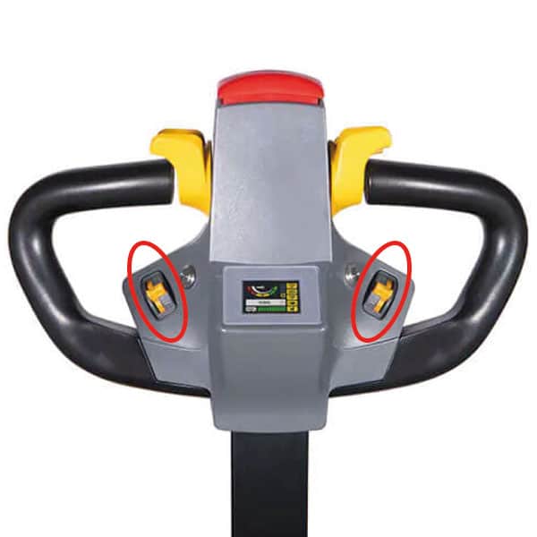Proporcionální ovládání zdvihu a spouštění je umístěno na obou stranách madla, takže práci lze pohodlně ovládat pravou i levou rukou. Rychlost zvedání a spouštění reaguje na intenzitu stisku – čím jemněji tlačíte, tím citlivěji vidlice reagují. Zdvih je plně proporcionální, zatímco spouštění má přednastavené rychlosti podle hmotnosti nákladu – do 450 kg jsou k dispozici tři úrovně, nad 450 kg pak dvě. To zajišťuje přesnou a plynulou manipulaci i s choulostivým nebo nestabilním nákladem.