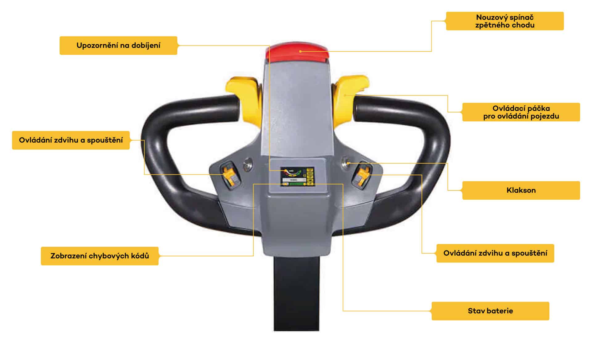 Patentovaná ovládací hlava je navržena s důrazem na ergonomii, bezpečnost a intuitivní ovládání. Pomocí směrových tlačítek lze snadno řídit jízdu i zdvih – jednou rukou. Režim želva umožňuje pomalý, jemný pohyb v úzkých prostorách nebo při přesném najíždění. Klakson zvyšuje bezpečnost provozu a nouzové tlačítko umožňuje okamžité zastavení v případě nečekané situace. Všechny prvky jsou snadno dostupné a zaručují plynulé a přesné manévrování bez námahy.